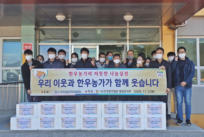 경남 함양군은 3일 전국한우협회 함양군지부(지부장 노우현)에서 한우 먹는 날을 맞이하여 지역사회 어려운 이웃에게 나눔행사로 한우불고기 112kg(400만원 상당)의 후원 물품을 전달했다고 밝혔다.
