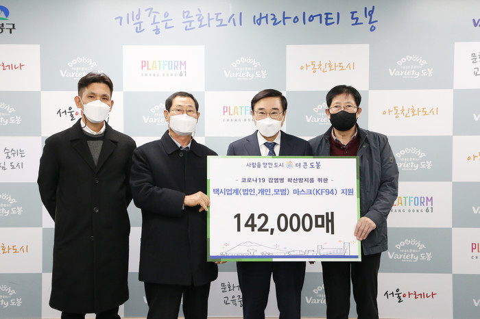 도봉구는 지난 8일 수도권 2.5단계 사회적 거리두기 시행에 따라 법인택시 21개 업체와 개인택시 및 모범 운전자회 등에 K94 마스크 총 14만2000장을 지원하는 방역물품(마스크) 전달식을 개최했다. 사진은 전달식에서 이동진 구청장(오른쪽에서 두 번째)과 관계자들이 기념촬영을 하는 모습. (사진제공=도봉구청)