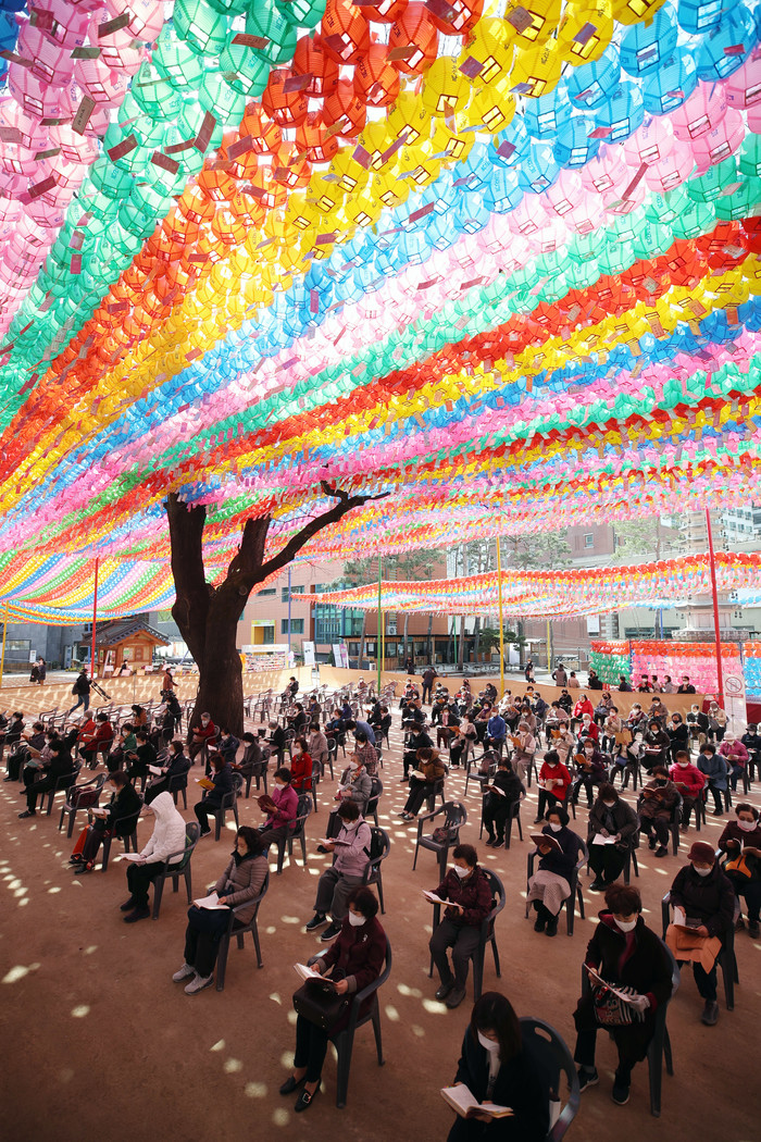 23일 서울 종로구 조계사에서 사회적 거리두기 강도 완화 이후 첫 초하루 법회가 열리고 있다.