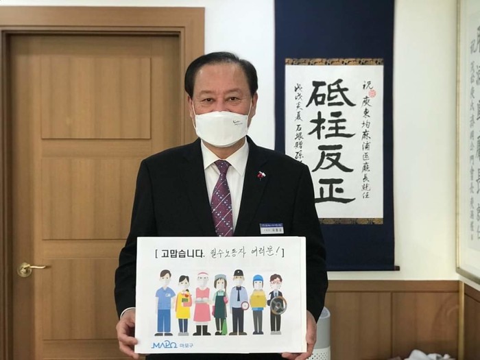 유동균 서울 마포구청장이 지난 15일 사회기능 유지에 핵심적 역할을 담당하는 필수노동자에게 고마움과 격려의 마음을 전하는 ‘고맙습니다. 필수노동자’ 릴레이 캠페인에 동참했다. 사진은 유 구청장이 ‘고맙습니다. 필수노동자 여러분!’이라고 적힌 팻말을 들고 캠페인에 참여하고 있는 모습. (사진제공=마포구청)
