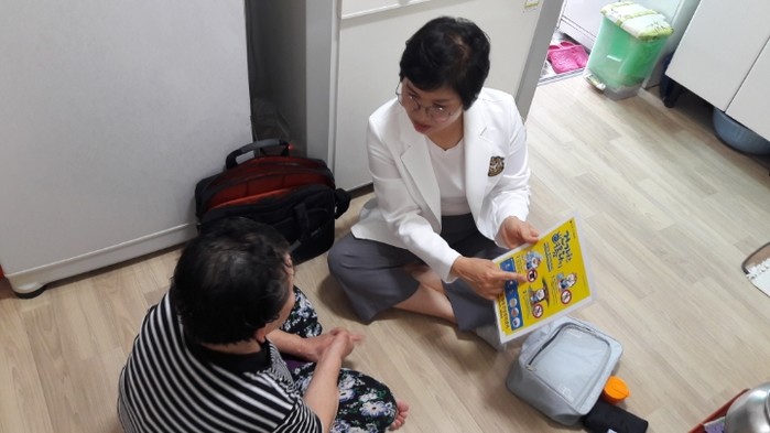 경기 하남시가 지역내 건강취약계층을 대상으로 건강관리 및 홍보활동을 강화한다. 저소득층 노인과 만성질환자 가정을 동별 담당간호사가 방문해 주거환경·건강 점검와 감염병 예방교육을 하고 방역약품과 양우산, 쿨토시 등을 배부할 예정이다. 사진은 담당간호사가 홀몸노인을 방문해 건강수칙을 교육하는 모습. (사진제공=하남시청)