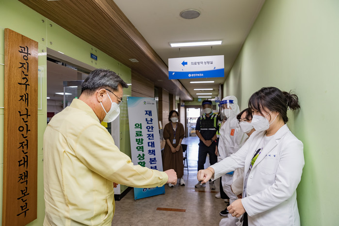 김선갑 광진구청장이 최근 광진구재난안전대책본부를 찾아 코로나19 장기화로 인해 고된 업무를 하고 있는 의료진을 격려했다. 사진은 김 구청장이(왼쪽) 의료진과 주먹인사를 하고 있는 모습. (사진제공=광진구청)