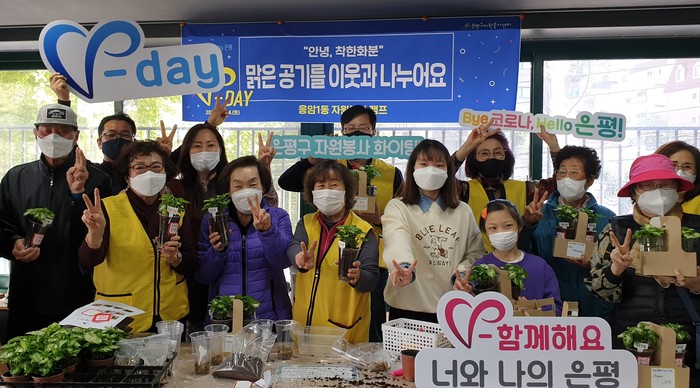 서울 은평구가 최근 ‘자원봉사 V-day’를 열고 지역 곳곳에서 ▲Hello 화분 ▲ 온라인 청소년사람책 컨퍼런스 ▲에코플러스 가족봉사단 및 프로젝트리더단 활동 ▲공무원 핸즈온 봉사 등을 진행했다. 사진은 행사 참가자들이 화분을 들고 기념촬영을 하고 있는 모습. (사진제공=은평구청)