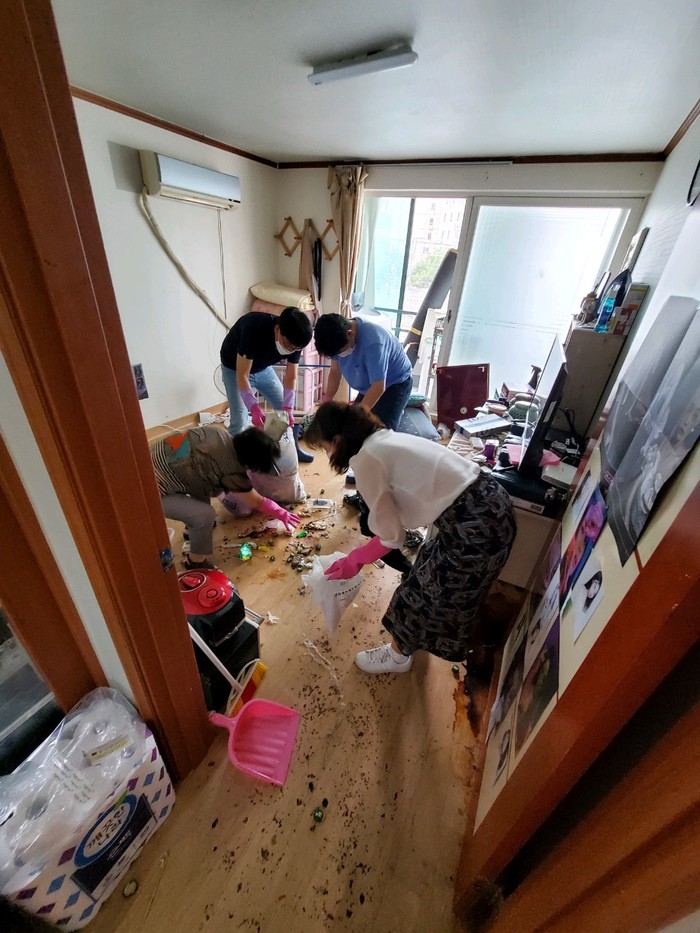 대상자는 임대주택에 거주 중인 알콜의존증 장년 1인 가구로, 집안에 쓰레기가 가득해 악취가 진동하고 위생상태가 불결해 청소와 방역이 시급한 상태였다.