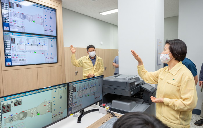 김수영 양천구청장이 24일 장마철을 대비해 서울시와 신월빗물저류배수시설 합동 점검을 실시했다. 사진은 김 구청장(오른쪽)이 중앙제어실에서 점검을 하고 있는 모습. (사진제공=양천구청)