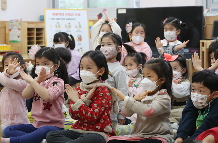 10일 오전 광주 북구청어린이집에서 북구청 아동보호팀 직원들과 지역 경찰이 아이들에게 아동학대 대처법 교육에 나섰다. 사진은 교육을 받는 아이들이 아동학대를 거부하는 의사를 표현하는 모습.