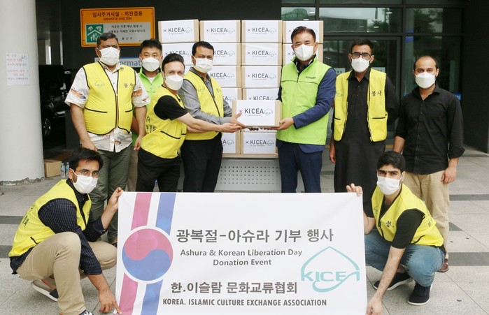 용산복지재단은 최근 한이슬람문화교류협회로부터 광복절을 기념해 지역내 저소득 가구를 위한 이슬람의 할라음식 키트 30개를 기부받았다. 키트는 할랄 인증받은 쌀 1kg, 밀가루 1kg 등으로 구성됐으며 푸드뱅크를 통해 대상자에 후원한다. 사진은 전달식에서 관계자들이 기념촬영을 하는 모습. (사진제공=용산구청)