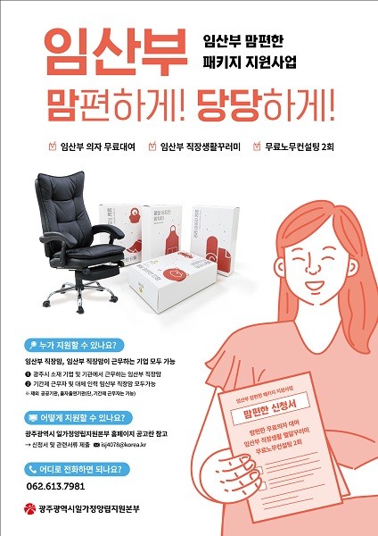지원 사업은 임신부 전용 맘편한 의자를 무료 대여하고, 전자파 방지를 위한 담요·임산부 배려푯말 등 직장생활에 필요한 직장생활 꾸러미, 근무환경 개선을 위한 모·부성 노무컨설팅 등 3개 분야를 종합 지원한다.