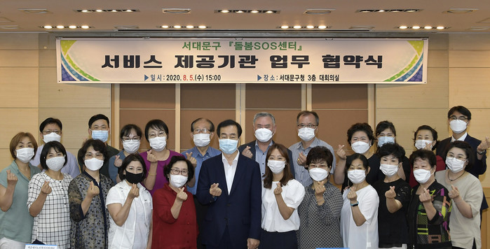 서울 서대문구가 이달부터 시범 운영을 시작하는 '돌봄SOS센터' 사업을 위해 25개 돌봄서비스 제공기관과 최근 업무 협약을 체결했다. 협약에 따라 이들 기관은 기존 돌봄서비스의 사각지대에서 일시적이고 긴급한 돌봄이 필요한 주민에게 맞춤형 서비스를 제공한다. 사진은 문석진 구청장(앞줄 왼쪽 여섯 번째)과 관계자들이 기념촬영을 하는 모습. (사진제공=서대문구청)