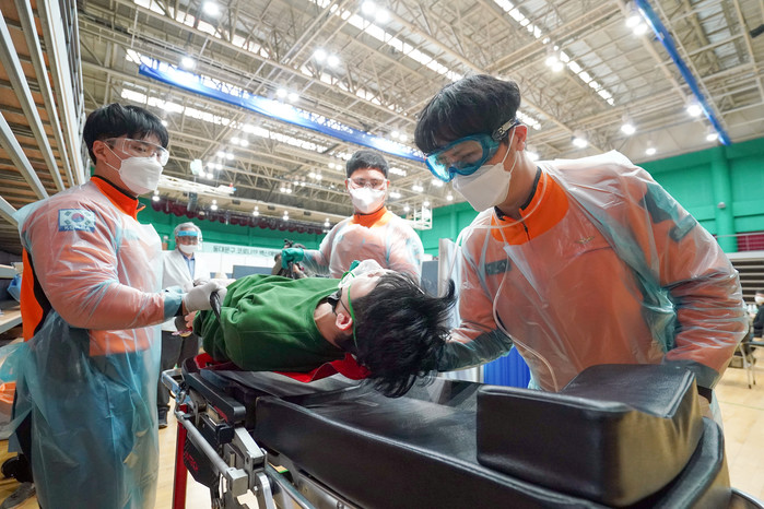 서울 동대문구는 1일 동대문구 백신접종센터인 동대문구체육관에서 ‘코로나19 백신접종 모의훈련’을 전개했다. 이날 훈련에서는 센터 운영과 관련된 내용 확인 및 시나리오 훈련, 돌발상황 발생 대처 훈련 등을 진행했다. 사진은 이날 모의훈련에서 백신접종 이상 환자를 협력의료기관 경희의료원으로 이송하고 있는 모습. (사진제공=동대문구청)