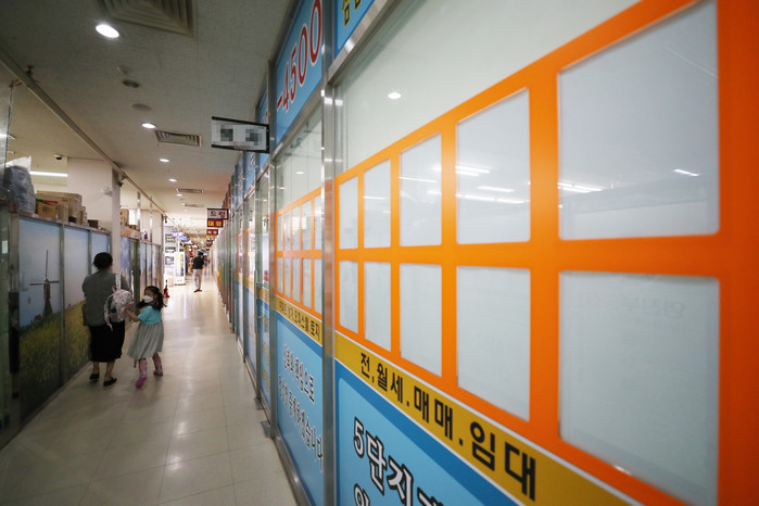 '임대차 3법'이 상임위원회를 통과한 29일 서울 송파구의 한 상가 부동산중개업소 매물 정보란이 비어있다. 임대차 3법의 시행이 다가오며 서울을 중심으로 전셋값 폭등 및 품귀 현상이 광범위하게 나타나고 있다.