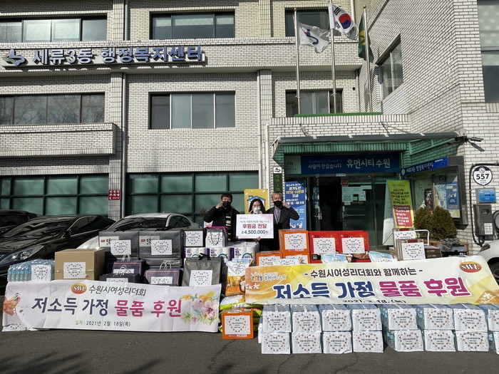 경기 수원시 여성리더회는 18일 권선구 세류3동 행정복지센터에 저소득층 가정을 위한 후원물품을 전달했다. 이날 전달된 물품은 백미 20kg, 휴지, 선물세트 등 일상생활에 필요한 생필품(450만원 상당)으로 세류3동의 기초생활수급자, 차상위계층 등에게 전달될 예정이다. 사진은 관계자들이 기념촬영을 하는 모습. (사진제공=권선구청)