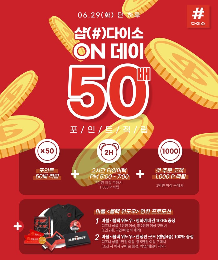 이번 이벤트는 29일 단 하루 동안 샵(#)다이소 앱을 통해 상품을 구매하는 고객 전원에게 조건 없이 다이소 멤버십 포인트 50배 적립 혜택을 제공한다.
