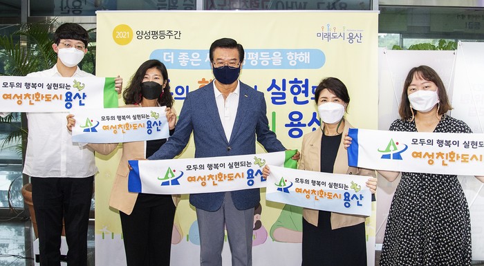 용산구는 양성평등 주간을 맞아 지난 1~7일 상담(일자리·취업 분야), 홍보(여성친화도시 사업), 전시(한국양성평등교육진흥원 양성평등 작품 공모전 수상작) 부스를 운영했다. 사진은 성장현 구청장(가운데)이 지난 7일 양성평등주간 행사 부스를 찾아 여성친화도시 조성을 위한 챌린지에 참여하고 있는 모습. (사진제공=용산구청)