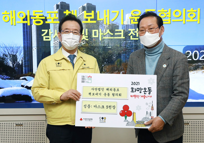 서울 강남구는 17일 (사)해외동포 책보내기 운동협의회로부터 지난해 마스크 1만장 지원에 대해 하와이 한인회가 제작한 감사패와 더불어 저소득층을 위한 방역 마스크 5000장을 전달받았다. 사진은 전달식에서 정순균 구청장(왼쪽)과 손석우 이사장이 기념촬영을 하는 모습. (사진제공=강남구청)