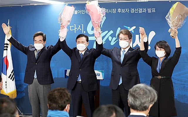 지난 6일 오후 부산 연제구에 있는 더불어민주당 부산시당에서 열린 부산시장 경선후보자 경선 결과 발표대회에서 이낙연 대표(왼쪽부터)와 부산시장 후보로 선출된 김영춘 후보, 변성완 박인영 후보가 손을 들어 인사하고 있다.
