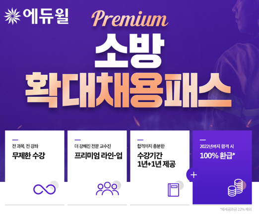‘소방 확대채용패스 프리미엄’ 과정에 대한 자세한 내용은 에듀윌 홈페이지를 통해 확인할 수 있다.