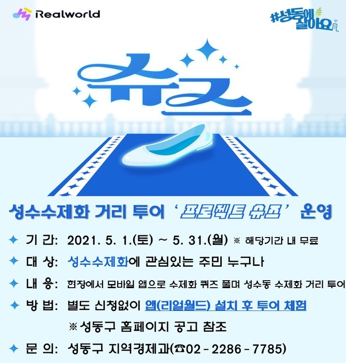현실 공간과 온라인 공간을 동시에 넘나들며 흥미롭게 성수 수제화에 대해 알 수 있도록 구성, 참여 완료 후 온라인 설문조사와 성동구 블로그 댓글 게시와 같은 성동구 SNS 이벤트 참여시, 무작위 추첨을 통해 음료쿠폰, 수제화 등 경품도 제공한다.