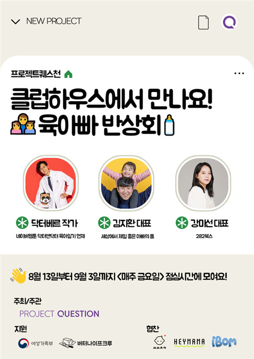 한편, 프로젝트퀘스천 육아빠 반상회는 여성가족부 청년 성평등 문화 플랫폼 '버터나이프 크루'가 지원하며, 아동 마스크 브랜드 ‘아이봄’과 엄마들을 위한 홈트 앱서비스 ‘헤이마마’, 아이들의 성장 사진 정리를 도와주는 앱서비스 ‘쑥쑥찰칵’ 등 육아관련 브랜드들이 아빠들을 위한 육아 제품을 협찬한다.