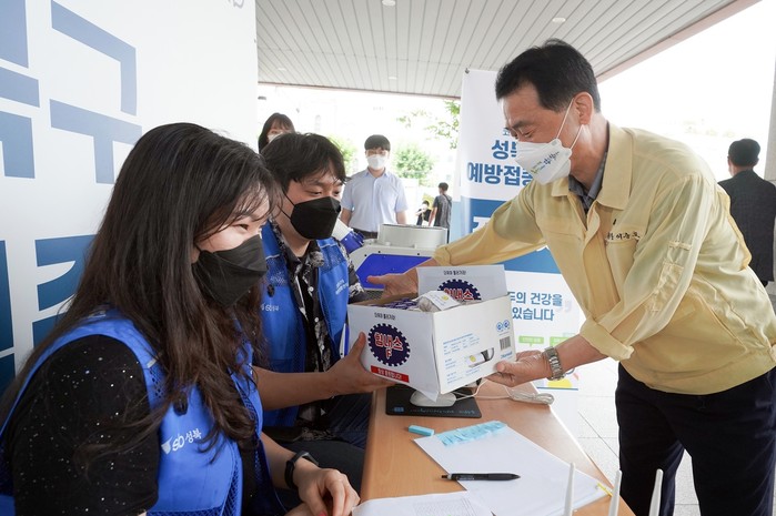 이승로 서울 성북구청장은 22일 더위와 코로나19 확진자 급증으로 고생하는 선별검사소 관계자를 위해 성북구 직원들이 마련한 응원 간식과 감사의 마음을 전했다. 사진은 이 구청장(오른쪽)이 지역내 선별진료소를 순회 방문하면서 성북구 직원이 준비한 선별검사소 관계자를 위한 응원 간식을 전달하고 있는 모습. (사진제공=성북구청)