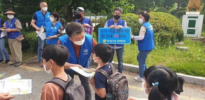 바르게살기운동 경기 양평군협의회가 21일 양동초등학교에서 '학교폭력 예방 캠페인'을 전개했다. 이날 캠페인에는 이미원 협의회장을 비롯해 전의현 양동초등학교장, 박대식 양동면장 등 20여명이 참석한 가운데 등굣길 학생들을 대상으로 학교폭력 예방을 위한 팸플릿 및 기념 수첩, 텀블러 등을 배부했다. 사진은 학생들에게 홍보 팸플릿 및 기념 수첩을 나눠주고 있는 모습. (사진제공=양평군청)
