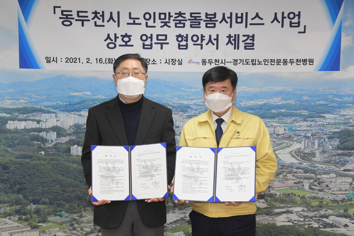 경기 동두천시가 16일 경기도립노인전문동두천병원과 노인복지 발전을 위한 업무협약(MOU)을 체결했다. 이날 협약에 따라 양기관은 시 노인맞춤돌봄서비스 대상자의 치매 예방 및 개별 맞춤형 사례관리 지원 서비스 제공을 통해 안정적인 삶의 질 향상을 함께 모색하기로 했다. 사진은 최용덕 시장(오른쪽)과 윤동원 병원장이 기념촬영을 하는 모습. (사진제공=동두천시청)