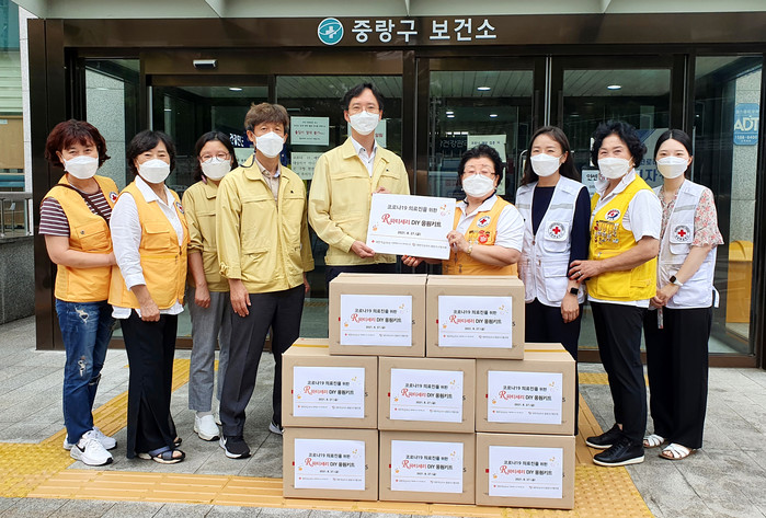 중랑구는 최근 대한적십자봉사회 중랑지구협의회로부터 코로나19로 지친 보건소 의료진을 격려하기 위한 간식을 전달받았다. 이번 전달식에서는 한 익명의 주민으로부터 기부받은 기부금으로 적십자봉사회 회원들이 쿠키·마들렌 등을 만들어 선별진료소 등 의료인력에게 전달했다. 사진은 전달식에서 관계자들이 기념촬영을 하는 모습. (사진제공=중랑구청)