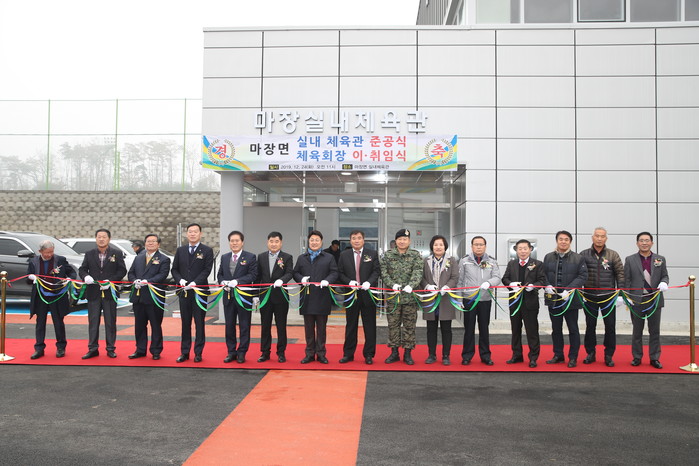 경기 이천시가 마장면 이치리에 지역 주민들을 위한 '마장면 실내체육관'을 건립하고 최근 준공식을 했다. 이날 준공식은 엄태준 시장을 비롯해 주민, 지역 의원 등이 참석한 가운데 진행됐다. 사진은 엄 시장(왼쪽 일곱 번째)과 관계자들의 테이프커팅 모습. (사진제공=이천시청)