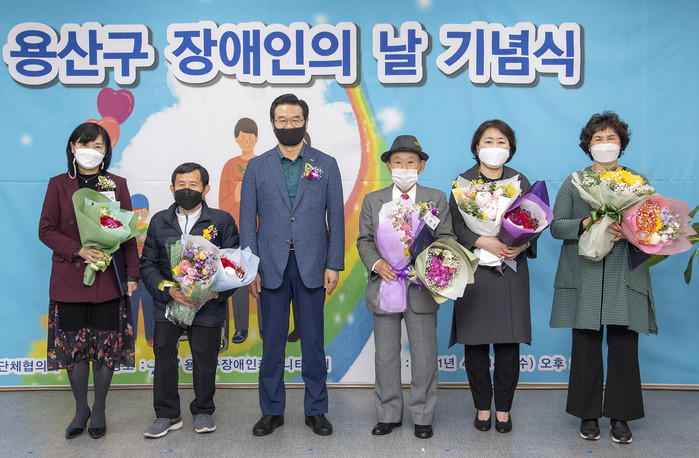 성장현 서울 용산구청장이 지난 14일 ‘제41회 장애인의 날 기념식’에 참석해 유공자 표창을 했다. 구는 코로나19로 전체 수상자(12명) 중 박인희·최명철·신후동·권민자·문명자씨만 행사에 참석토록 했다. 사진은 성 구청장(왼쪽에서 세 번째)이 표창을 받은 유공자들과 기념촬영을 하는 모습. (사진제공=용산구청)