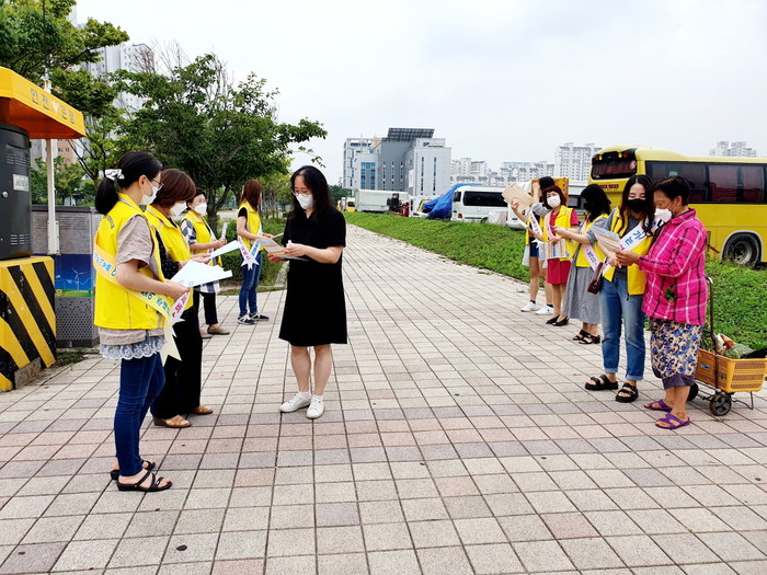 경기 수원시 권선구 호매실동 지역사회보장협의체는 30일 복지사각지대 발굴을 위한 캠페인을 통해 지역주민을 대상으로 홍보용품(손소독제)과 전단지를 배부했다. 사진은 이날 캠페인에서 주민들에게 전단지를 배부하고 있는 모습. (사진제공=권선구청)