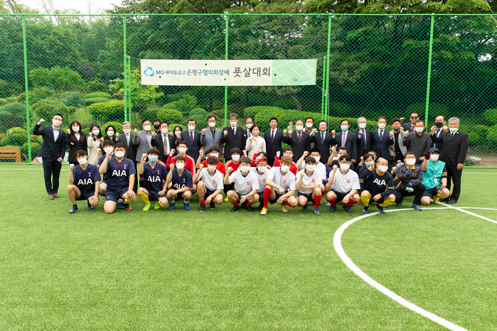 은평구와 새마을금고 은평구 협의회가 최근 은평의 마을에서 ‘풋살구장 준공식’을 개최했다. ‘풋살구장’은 구와 지역내 9개 새마을금고가 함께 지역희망공헌사업의 일환으로 추진됐다. 사진은 이날 행사에 참가한 참가자들이 기념촬영을 하고 있는 모습. (사진제공=은평구청)