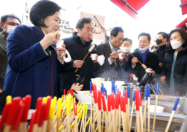 더불어민주당 이낙연 대표가 지난 23일 오전 서울 중구 남대문시장에서 서울시장 보궐선거 경선에 나서는 우상호 의원(왼쪽 세번째), 박영선 전 중소벤처기업부 장관(왼쪽)과 어묵을 먹고 있다.
