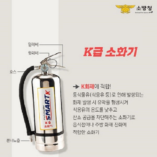 K급 소화기는 주방 화재 진화에 적합한 소화기다. 동ㆍ식물유(식용유 등)로 인한 화재 시 기름 표면에 순간적으로 유막 층(비누화 작용)을 만들어 산소를 차단하고 불이 다시 붙는 것을 막는다. 또 기름 온도를 빠르게 낮춰 재 발화를 방지할 수 있다.