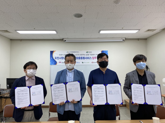 경기 포천시노인복지관·포천나눔의집 돌봄센터·포천시무한돌봄행정복지센터는 취약노인의 생활환경 개선을 위해 지역내 봉사단체인 '포천사랑나눔회'와 최근 업무협약을 체결했다. 이 협약을 통해 노인맞춤돌봄서비스 대상자 중 주거환경이 열악한 가정의 집수리를 지원할 계획이다. 사진은 협약식 후 관계자들이 기념촬영을 하는 모습. (사진제공=포천시청)