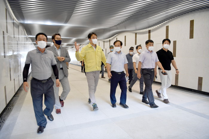 김상호 경기 하남시장은 21일 하남미사경정공원 입체화 연결통로 건설 현장을 찾아 진행상황을 점검했다. 이 통로는 길이 93m·폭 6m로 주민들이 미사종합운동장 남측에서 미사경정공원을 지하로 이동할 수 있도록 설계됐으며, 오는 9월 개통을 목표로 하고 있다. 사진은 김 시장(가운데)과 관계자들이 현장을 둘러보고 있는 모습. (사진제공=하남시청)