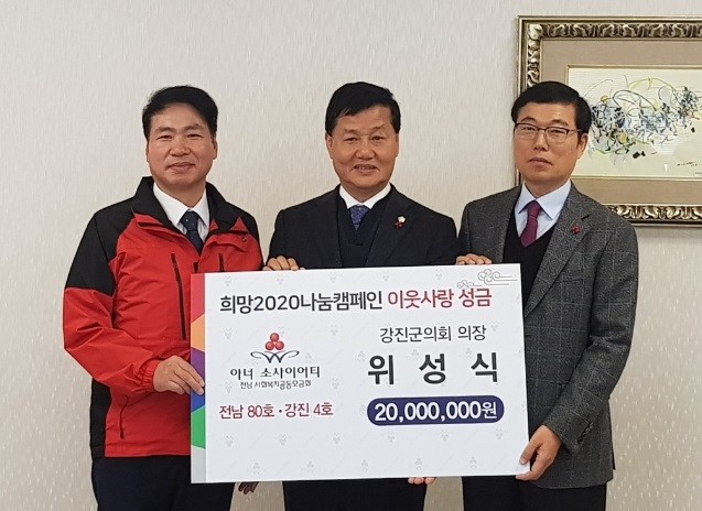 위성식 의장(66세)은“나눔과 베풂에 앞장서는 분위기를 확산시켜 더불어 함께 살아가는 강진을 만들어 가고자 한다. 관내 어려운 이웃들이 행복한 삶을 살아갈 수 있도록 힘을 보태고 싶다.”는 뜻을 밝혔다.