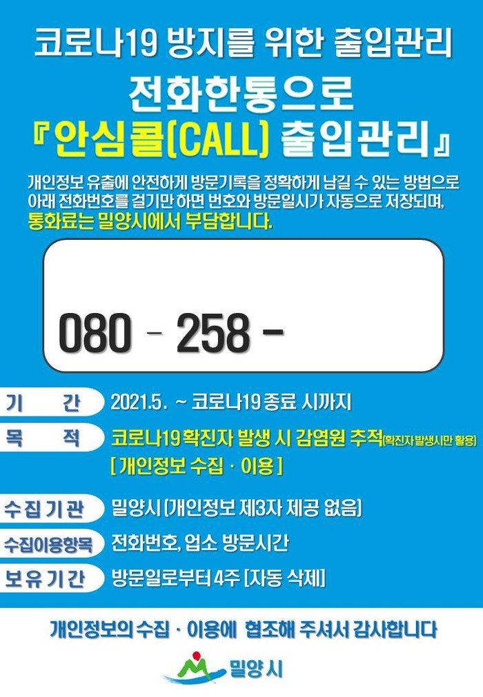 밀양시는 코로나19 확산방지를 위해 관내 다중이용시설에 무료로 지원하고 있는 안심콜 출입관리서비스 사업이 성공적으로 진행되고 있다고 밝혔다.