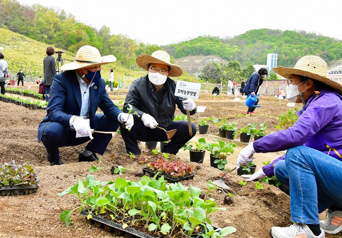 서울 중랑구는 최근 중랑행복1농장에서 중랑도시농업협동조합 주최로 모종나눔 행사를 진행했다. 이날 텃밭을 분양받은 구민들은 쌈채소 모종 5종 등을 받고 직접 심었으며, 모종 심는 요령 등의 관련 교육이 진행됐다. 사진은 행사에 참석한 류경기 구청장(가운데)이 텃밭에 모종을 심고 있는 모습. (사진제공=중랑구청)