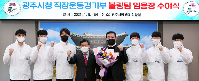 경기 광주시가 지난 5일 시청 직장운동경기부 볼링팀 임용장 수여식을 열고 김영선 감독 및 선수 등 7명에게 임용장을 수여했다. 사진은 이날 수여식에 참여한 신동헌 시장(왼쪽 네 번째)과 감독 및 선수들이 기념촬영을 하는 모습. (사진제공=광주시청)