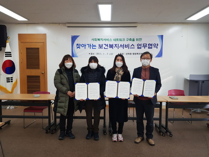인천 연수구 선학동 행정복지센터·지역사회보장협의체는 지난 8일 지역내 저소득층 삶의 질 향상을 위해 인하안경 연수점·백년백세 춘천닭갈비와 ‘시력플러스 건강증진 사업’ 업무협약을, 봄날엔청소와는 ‘찾아가는 플러스 클린데이’ 업무협약을 체결했다. 사진은 ‘찾아가는 플러스 클린데이’ 협약식에서 관계자들이 기념촬영을 하는 모습. (사진제공=연수구청)