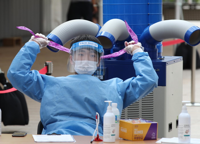 폭염특보가 내려진 14일 서울광장 임시선별검사소에서 의료진이 더위를 식히고 있다. 중앙방역대책본부는 이날 오전 0시 기준 신규 확진자가 전날보다 465명 늘어난 1615명이라고 밝혔다.
