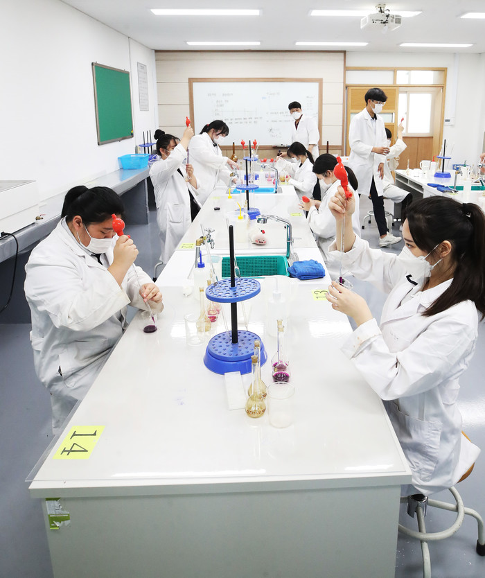 코로나19 확산으로 고3을 제외한 수도권 유치원과 초·중·고교 전면 원격 수업이 실시된 26일 오후 경기 수원시 팔달구 삼일공업고등학교에서 3학년 학생들이 실습수업을 하고 있다.