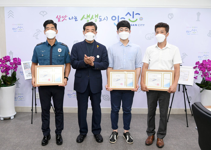 경기 안산시는 23일 교통사고로 시화호에 빠져 의식을 잃은 차량 운전자를 구한 시민 여승수·최용익씨, 안산단원경찰서 호수지구대 소속 정유철 경장에게 ‘용감한 시민 표창장’을 수여했다. 사진은 수여식에서 윤화섭 시장(왼쪽 두 번째)과 수상자들이 기념촬영을 하는 모습. (사진제공=안산시청)