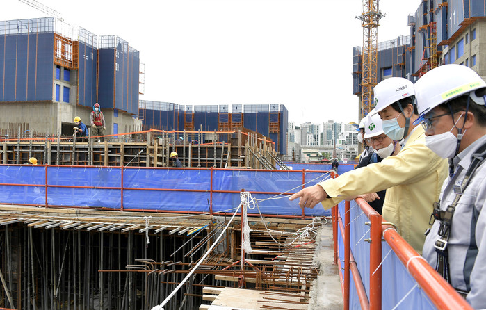 문석진 서울 서대문구청장이 2일 구청 간부직원, 민간 건축사와 토목구조기술사 등과 함께 홍제3구역과 모래내·서중시장 재개발 공사 현장을 방문해 우기 대비 민관 합동 안전점검을 했다. 사진은 문 구청장 관계자들이 홍제3구역 재개발 공사 현장을 둘러보고 있는 모습. (사진제공=서대문구청)