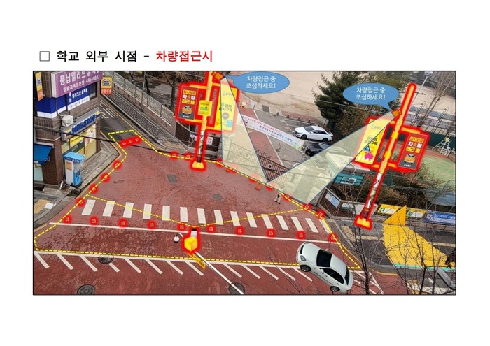학교 앞 교차로에 차량이 진입하면 영상으로 검지·인식해 매립형 경관등이 빛나고 전광판에는 경고 그림과 문구가 나타난다. 또한 초지향성 스피커를 통해 어린이 보행자가 주의를 끌도록 음성 안내까지 송출한다. 차량이 접근하지 않을 때에는 전광판을 통해 ‘송송파파’ 송파구 캐릭터를 활용한 교통안전 문구를 표출해 어린이 안전의식을 제고한다.