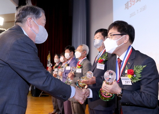 | ▲SK인천석유화학 최윤석 사장(사진 오른쪽)이 인천상공대상 시상식에서 심재선 인천상공회의소 회장으로부터 트로피를 받고 있다. |