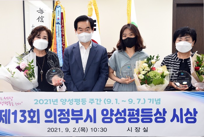 경기 의정부시가 2일 2021년 양성평등주간을 기념해 제13회 의정부시 양성평등상을 시상했다. 올해 수상자는 양성평등 문화확산 부문에 강난규 회장, 여성의 사회참여 확대 부문에 정미자 이사 등 4명이 선정됐다. 사진은 시상식에서 안병용 시장(왼쪽 두 번째)이 수상자들과 기념촬영을 하는 모습. (사진제공=의정부시청)