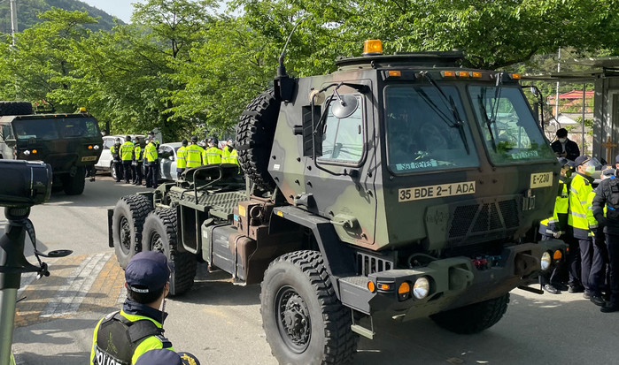 28일 오전 사드(THAAD·고고도미사일방어체계)기지 입구인 경북 성주군 초전면 소성리 마을회관 앞 도로에 사드기지로 들어가는 장비를 실은 군용차량이 지나가고 있다.