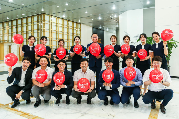 | ▲ '닥터헬기 소생 캠페인'에 참여한 송종욱 은행장과 직원들의 기념촬영 모습. (사진제공=광주은행) |