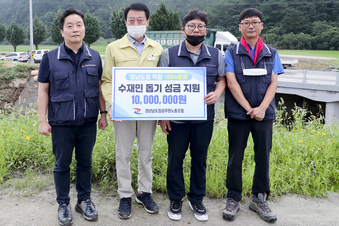 경상남도청 공무원노동조합(위원장 신동근)은 12일 오전 율곡면 두사리 수해 피해 현장에서 수해복구 성금 1,000만원을 합천군(군수 문준희)에 전달했다.